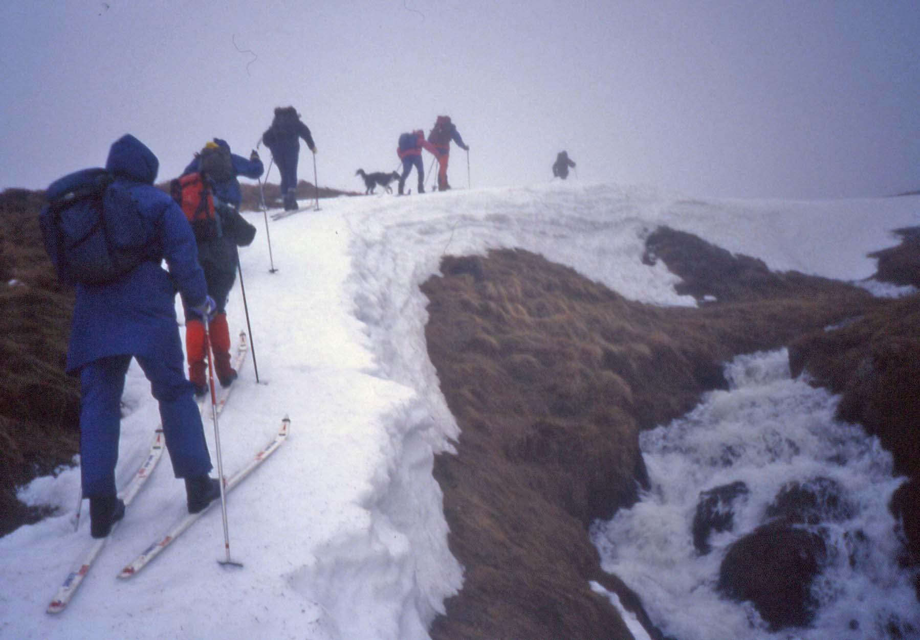 The actual skiing that the club did in these early years depended at first on falls of local snow, so the committee devised a Snowline whereby members could notify each other of where it had fallen and skiing was possible. The local parks such as Dunham Massey, Tatton and Lyme Park were prime centres, as were accessible routes and slopes in Cheshire and the Peak District such as Delamere Forest, Rushup Edge and Edale, the foothills of Snowdonia such as around Clocaenog Forest and above the Conway Valley, hills in the Lake District such as the Dodds near Keswick and others in the Pennines such as High Cup Nick above Dufton. Nigel James regularly visited Scotland, as did Bob Scoltock, having a special interest in an outstanding equipment centre in Braemar, to which many others followed them and which gave good access to touring around the Glenshee area in particular. Members reported on and supported various ski centres in the Lake District or Scotland which offered training and accommodation, such as Langden Beck or Glenisla. Even more ambitiously, members also travelled abroad to ski, principally to Norway, eventually finding a ski centre in the Telemark region called Kvitavatn which became a club favourite and to which members often returned later, sometimes on an individual basis, sometimes on club holidays, since both track and downhill skiing were available.